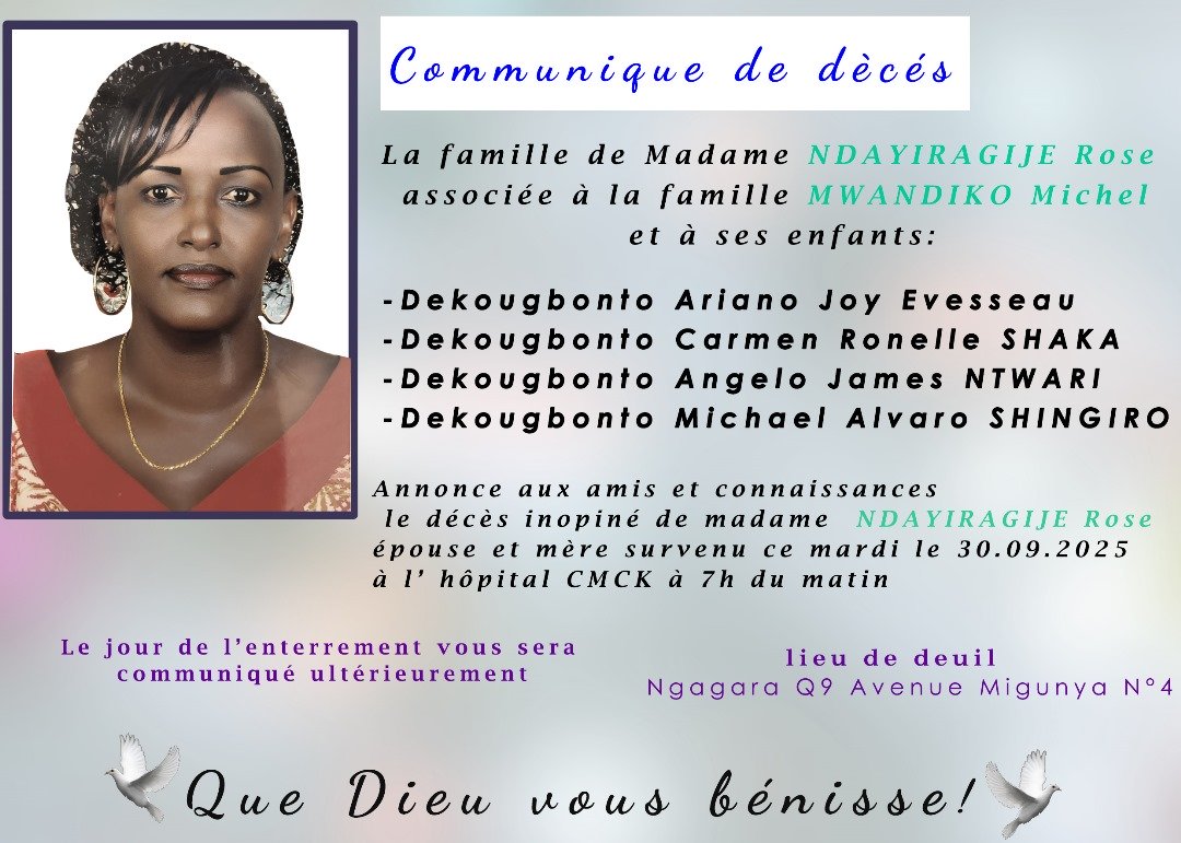 Le Centre International de Recherche et de Documentation sur les Traditions et les Langues Africaines, CERDOTOLA, a la profonde douleur d’annoncer le rappel à Dieu, ce 30 Septembre 2025 à Bujumbura (Burundi), de Madame Rose NDAYIRAGIJE, Représentante et Directeur du Bureau Régional du CERDOTOLA pour l’Afrique de l’Est et l’Afrique Australe.